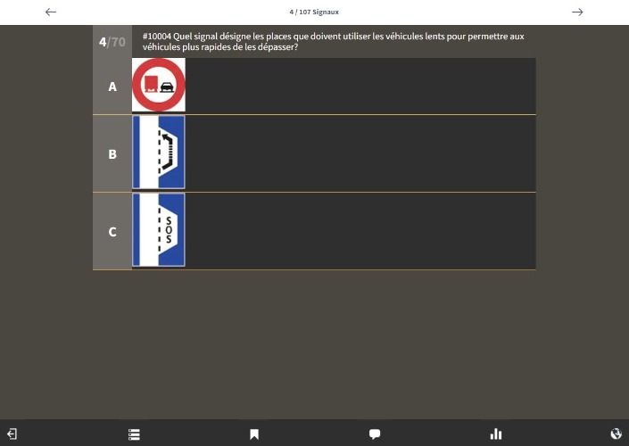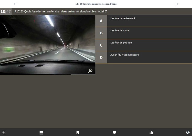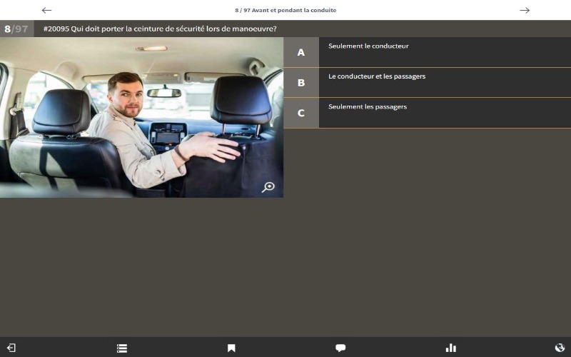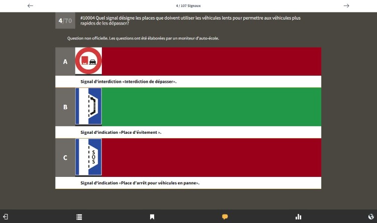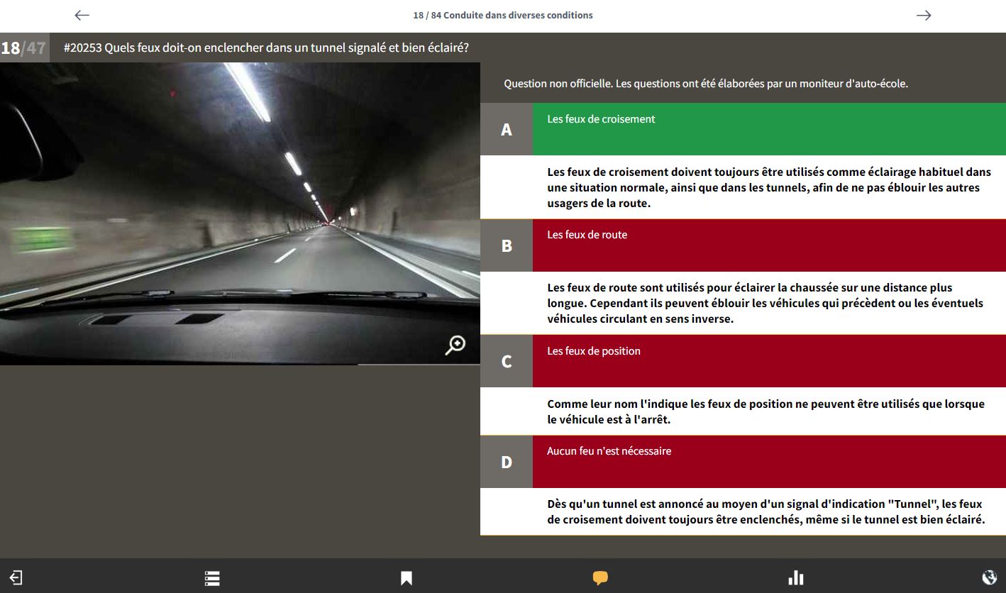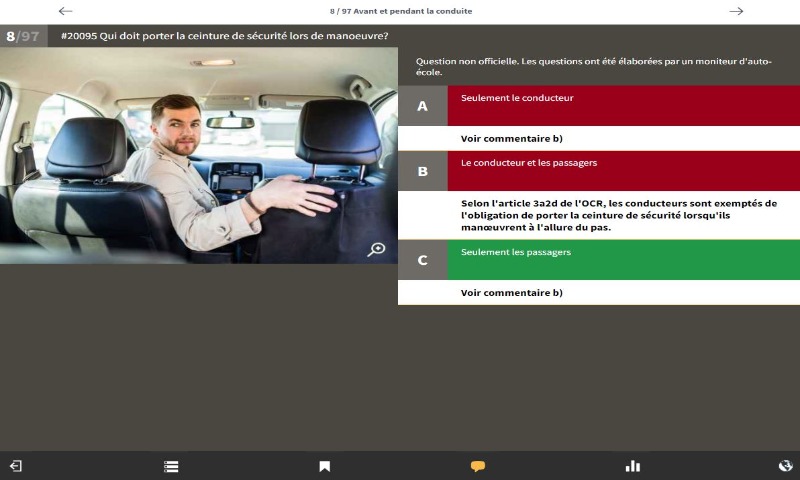 Commentaires d’experts: Toutes les questions sont commentées par des experts de l’examen du permis de conduire et les réponses sont justifiées. Si votre réponse est fausse, le commentaire de l’expert vous expliquera la raison de votre erreur. Apprenez par vos erreurs.