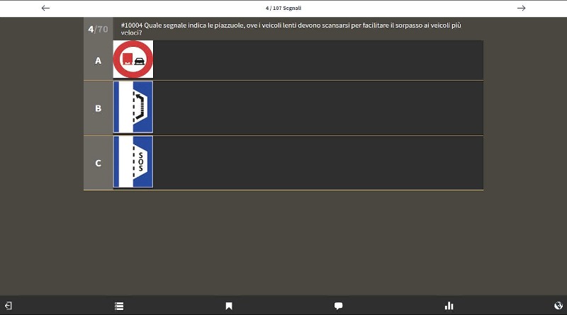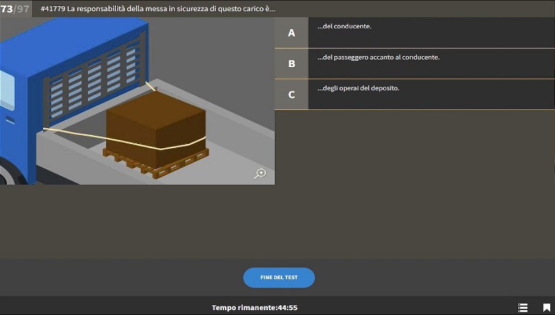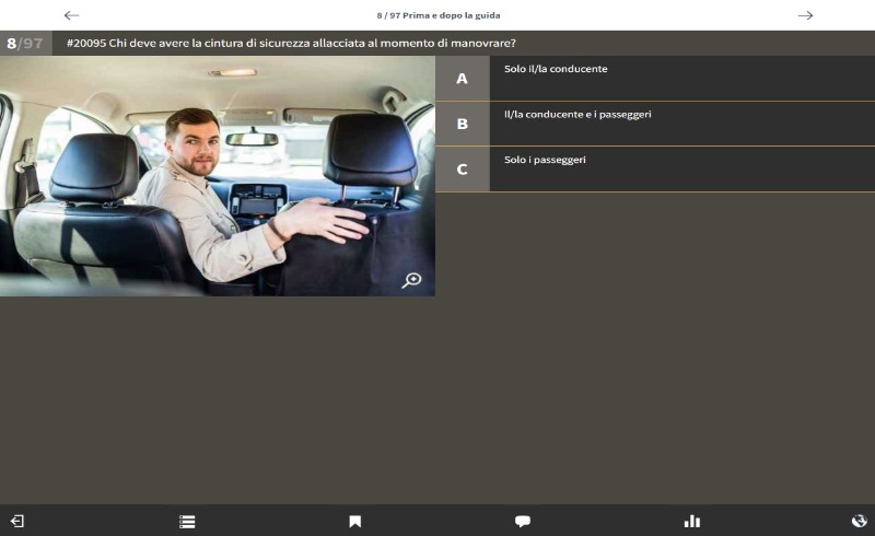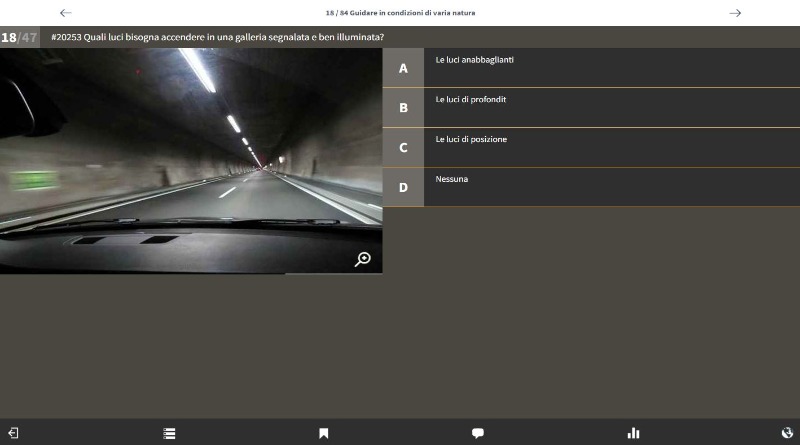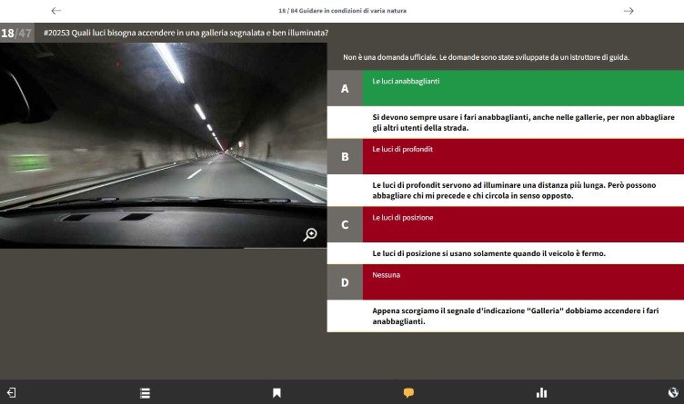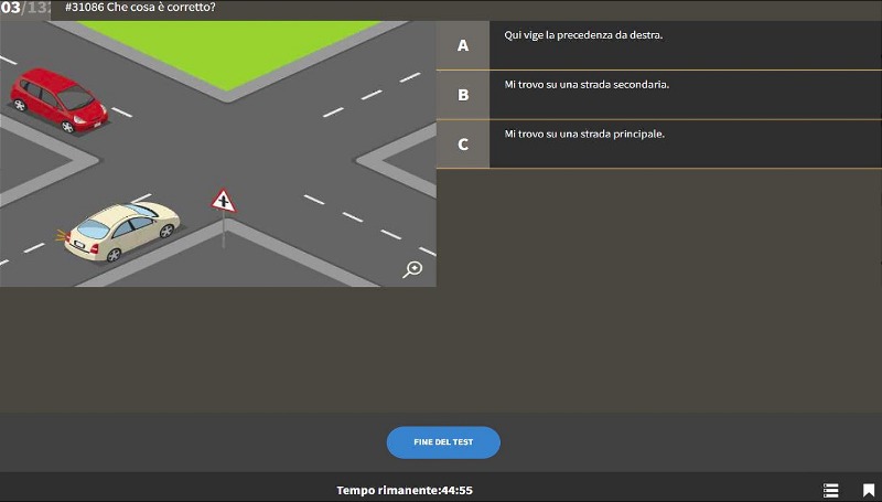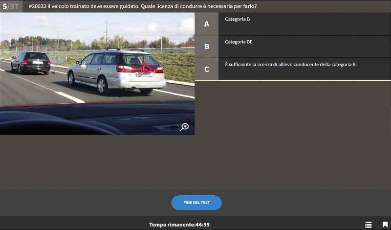 Quando è arrivato il momento e Lei si sente sicuro può passare all’esame teorico di prova, così come lo si propone ufficialmente. Vengono scelte 50 domande a caso e lei ha 45 min. di tempo a disposizione per rispondere. Se Lei supererà più volte questo test senza problemi, sarà sicuramente pronto per affrontare l’ esame teorico ufficiale.
